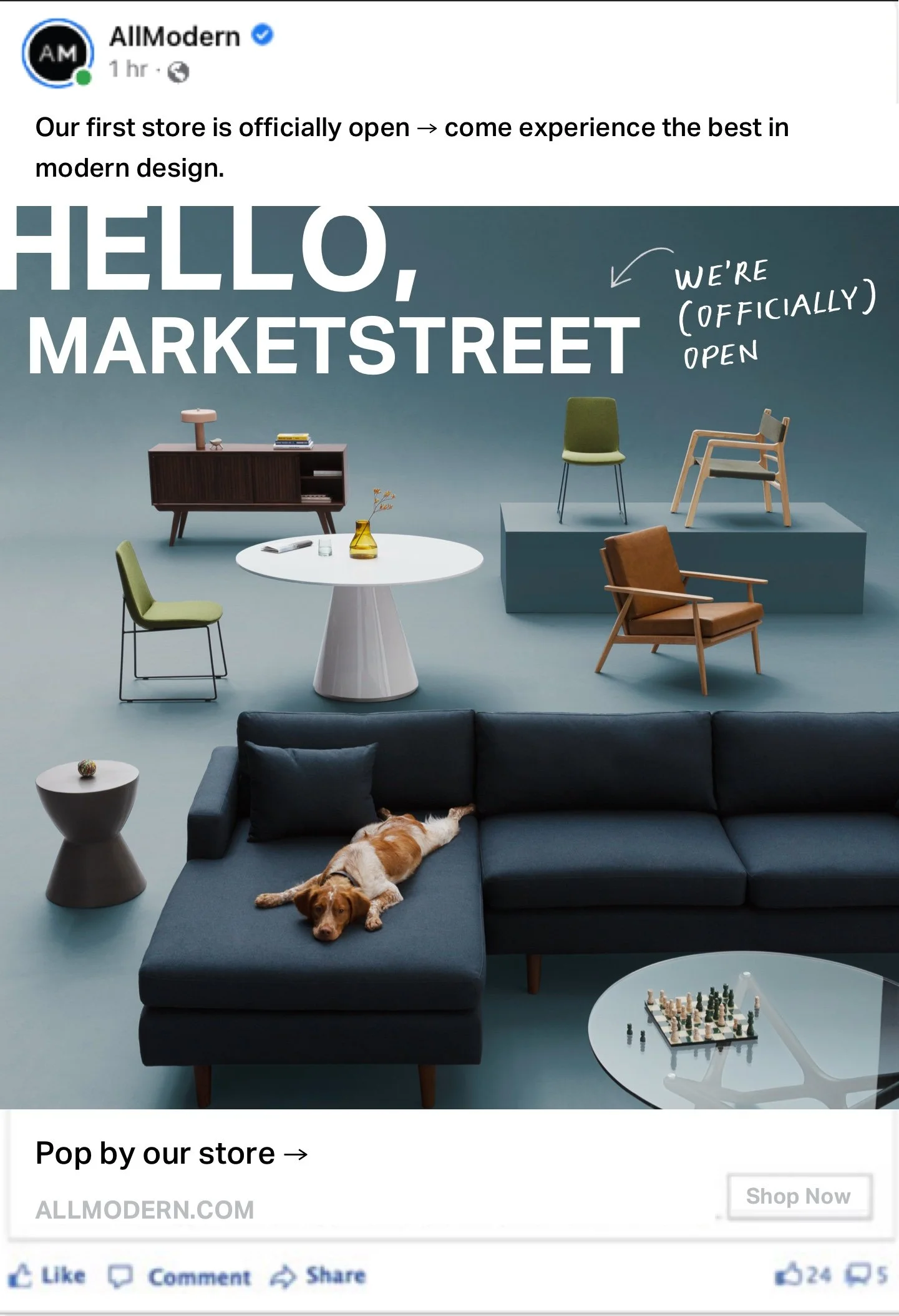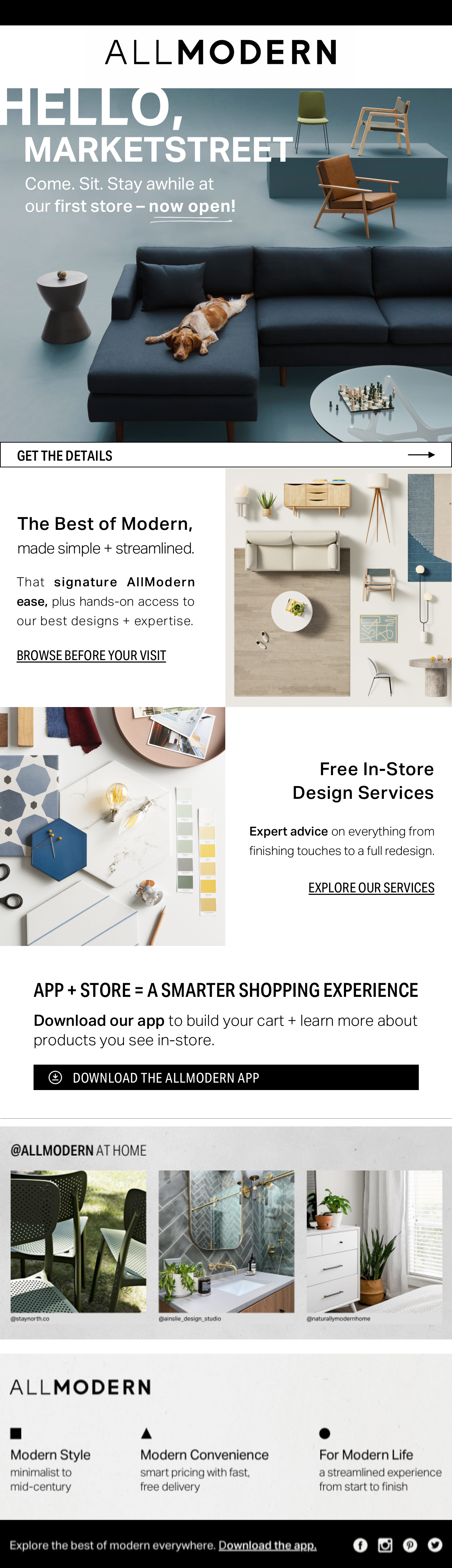 AllModern currently has 3 retail stores Lynnfield, Dedham and Austin.